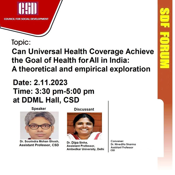 The council for Social Development (CSD) came into being in 1962 under the leadership of Durgabai Deshmukh as an informal group of scholars with the objective of conducting seminal research in the area of social development. It was formally registered in 1970. Over the last five decades, the research undertaken by the scholars in the Council has not only expanded the contours of research in the domain of social development but has also helped policy makers and development practitioners in formulating people-centric policies.