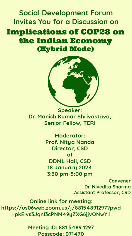 The Social Development Forum (SDF) discussion on “Ïmplications of COP28 for the Indian Economy” at the Council for Social Development, New Delhi on 18 January 2024 at 3:30 pm.