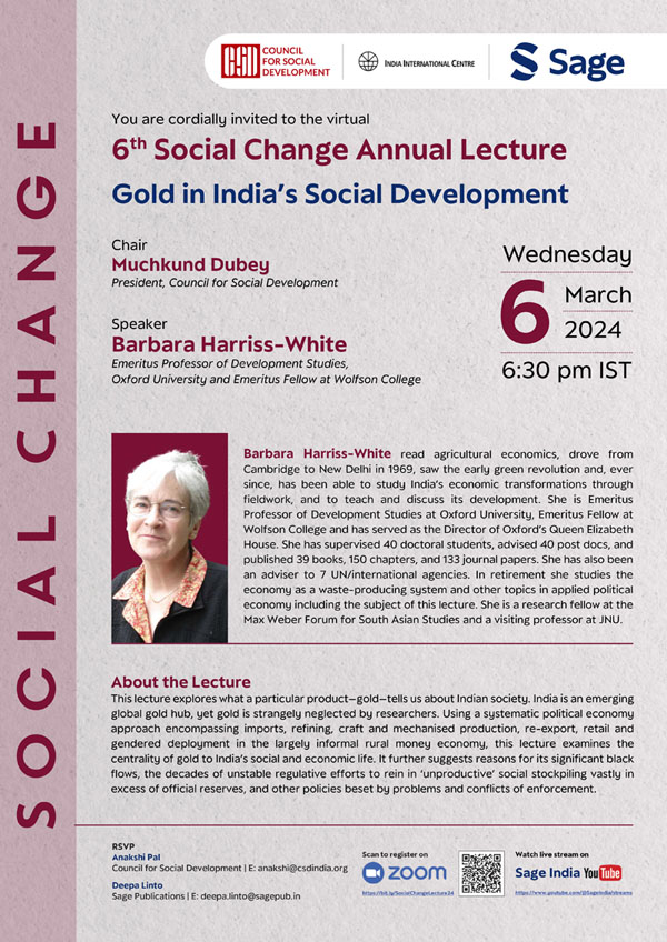 This year’s lecture delivered by Professor Barbara Harriss-White, and is titled ‘Gold in India’s Social Development’.