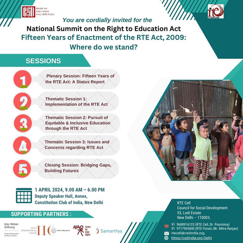 Introduced by the government of India in 2009, the RTE Act became effective on April 1, 2010. This legislation enshrined the fundamental right to education for every child aged 6 to 14 years, and aimed to foster equality, social justice, and democracy. The larger goal was to provide inclusive elementary education to all, regardless of government affiliation. Despite noble intentions, the effective implementation of the RTE Act has been marred by challenges such as varying progress across states, financial constraints, and implementation hurdles, further exacerbated by the COVID-19 pandemic. As the nation marked 15 years of the Act’s implementation on April 1, 2024, the National Summit, organized by the RTE Cell at the Council for Social Development (CSD), New Delhi, in collaboration with the RTE Forum, served as a platform for dialogue, collaboration, and reflection.