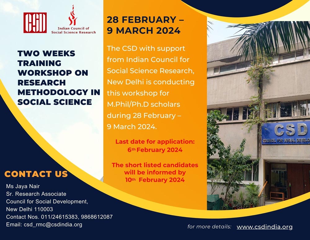This year, the CSD with the funding support from Indian Council for Social Science Research New Delhi is conducting this workshop for research scholars from 28th February – 9th March 2024. The content of the workshop is designed in a way that it equips scholars of different social science disciplines with critical understanding of theoretical and philosophical foundations of social science research as well as empirical tools and techniques required for conducting research in social sciences. While the focus of the workshop is tilted towards the quantitative methods, the participants of the workshop will also be introduced to qualitative and mixed method approach. The curriculum of the workshop is designed in congruence with the guidelines provided by the ICSSR.